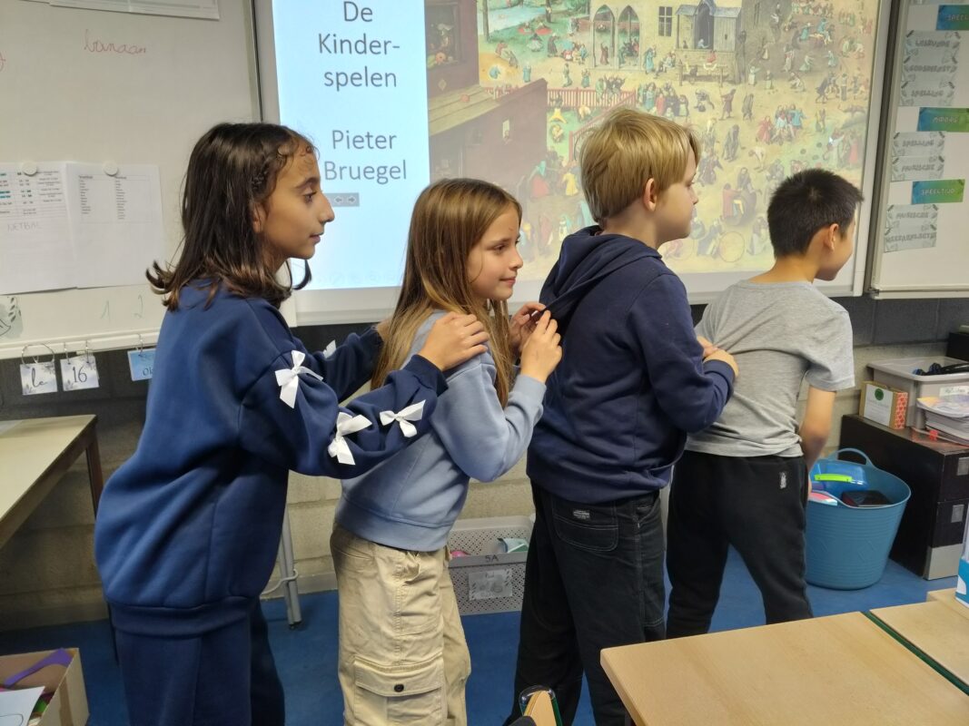 Tijdens de muzische dramales gingen we aan de slag met het schilderij ‘De Kinderspelen’ van Pieter Bruegel. We zoomden in op een bepaald deeltje van het schilderij en maakten hierover een toneelstuk. Op het einde bevroren we ons toneel en maakten we een tableau vivant. Kunnen jullie vinden op het schilderij welk deeltje de kinderen gekozen hadden?